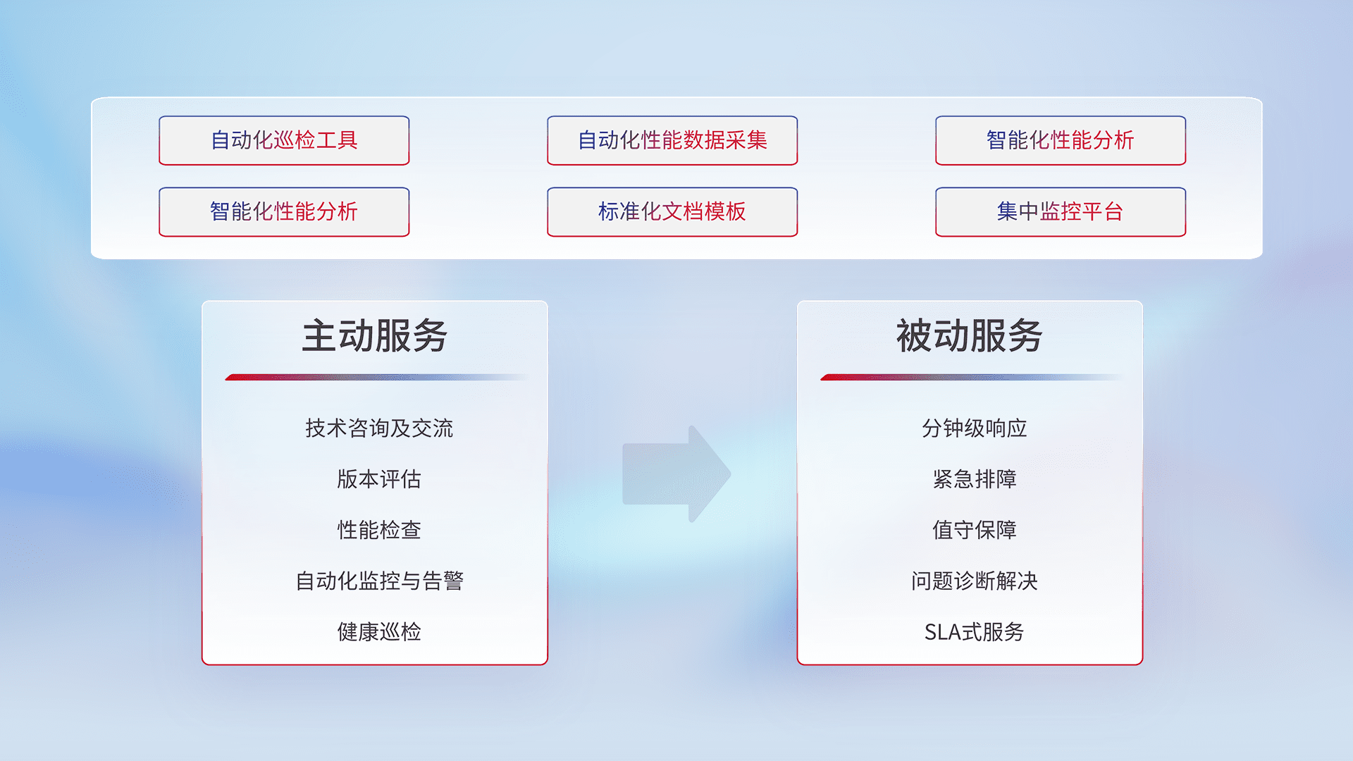 智能化工具和标准化文档,,,保障服务质量,,,,提供主动服务(包含技术咨询、、、版本评估、、、、性能检查、、、、自动化监控与告警、、健康巡检)和被动服务包含(分钟级响应、、、、紧急排障、、、值守保障、、问题诊断解决、、SLA服务)。。。。